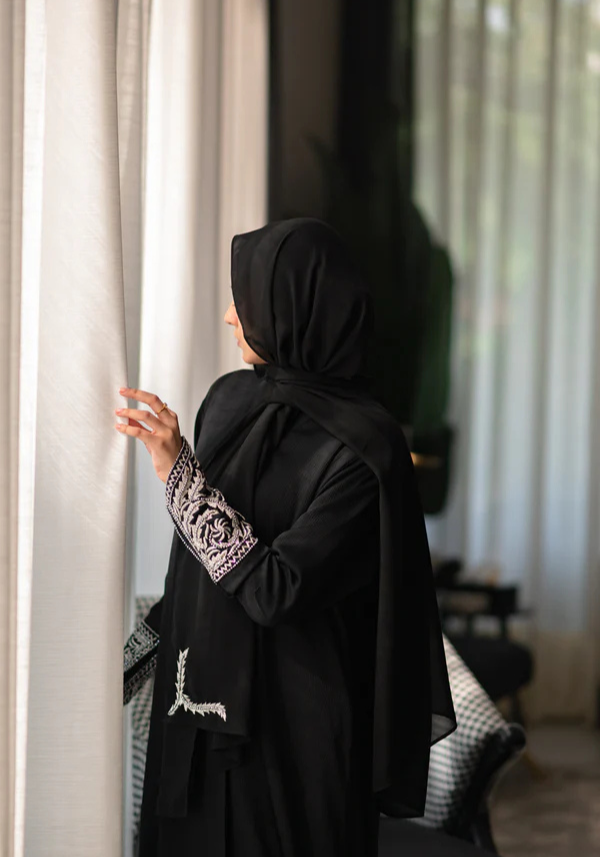 Malekah Abaya is the crown of this collection. With a heavy precious embellishment work on the princess like sleeves of the abaya, and the hijab edges, it is definitely a house queen, hence the name Malekah. The work speaks for itself. We have kept the sleeves heavy and the rest of the abaya minimal to highlight the work and maintain a sleek look!